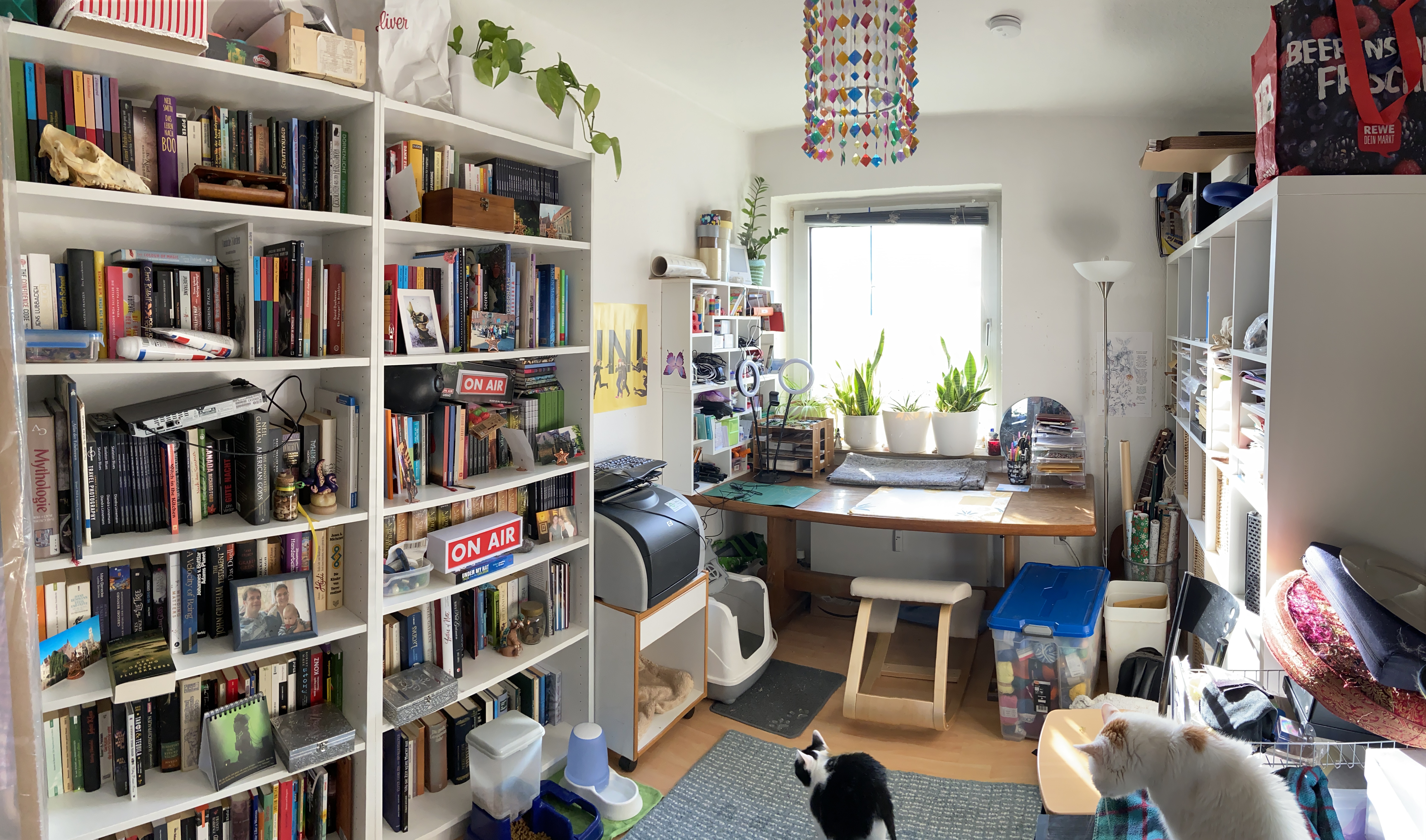 Es hat zwei Woche gedauert und ich habe ziemlich geflucht, aber jetzt ist mein Büro wieder fast komplett einsatzbereit. Ich muss dem Chaos in den Regalen noch Herr werden, und da rechts, wo Greebo sitzt, steht ein Schränkchen, das auf den Sperrmüll soll – da allerdings unser Keller komplett voll steht, muss das hier oben wohnen bleiben, bis wir es an die Straße stellen können.