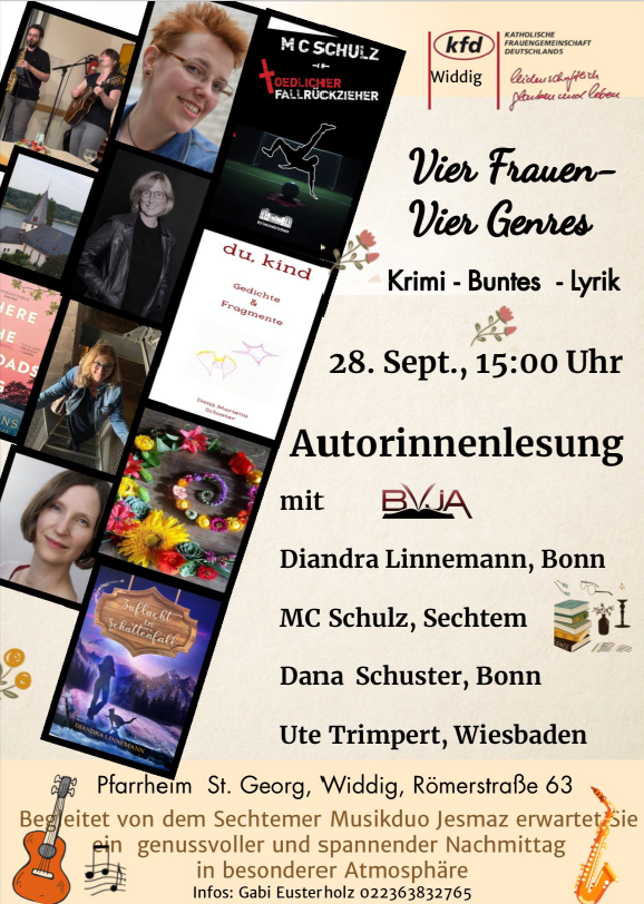 Auf jede Lesung freue ich mich wie ein Schnitzel. Und vor jeder Lesung bin ich nervös wie ein Grundschüler beim Krippenspiel. Trotzdem sollt ihr natürlich alle kommen, denn am 28. September bieten ab 15:00 h in Bornheim-Widdig vier Frauen Texte aus vier unterschiedlichen Genres dar, und ich schwör: Das wird gut.